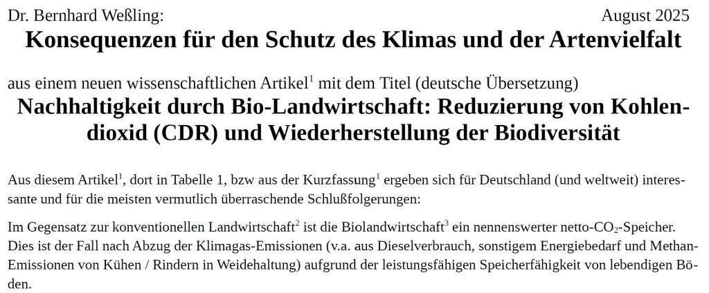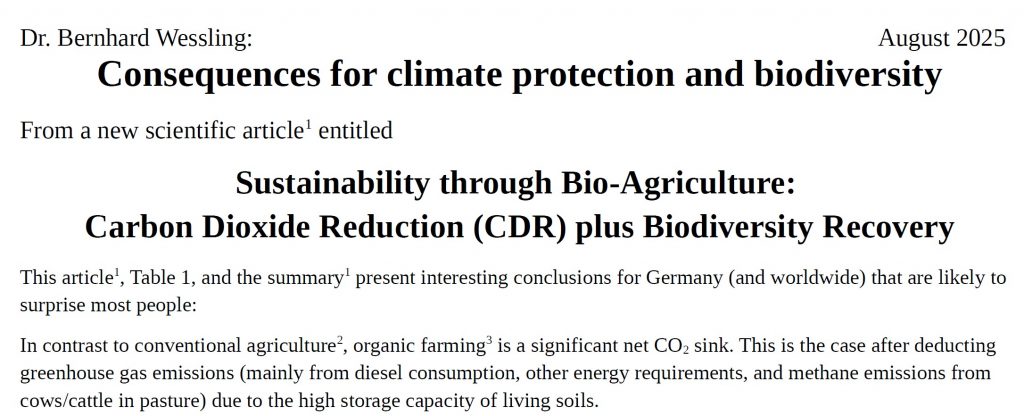 Im Gegensatz zur konventionellen Landwirtschaft trägt die Biolandwirtschaft nennenswert zur CO2-Speicherung bei. Dies gilt aufgrund der großen Speicherfähigkeit lebendiger Böden auch nach Abzug der Klimagasemissionen u.a. aus Kraftstoffverbrauch, sonstigem Energiebedarf und der Methan-Emission von Kühen und Rindern in Weidehaltung.