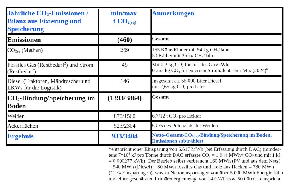 So liefert der Kattendorfer Hof Klimaschutz im Wert von jährlich ca. 250.000 €, wenn man den EU-CO2-Emissionshandelskurs von 73 €/t zugrunde legt, bzw. 0,5 bis 1,7 Million €, wenn Kosten wie für DAC/CCS(2) vergütet würden. Mit DAC/CCS wollen Unternehmen Geld verdienen, aber zusätzlich zu ihrem extremen Energiebedarf tragen sie zum Artenschwund bei. Stattdessen sollten Biolandwirte für ihre Leistungen im Arten- und Klimaschutz bezahlt werden, zumal sie keine zusätzliche Energie dafür benötigen. Sie benötigen nur Energie für den landwirtschaftlichen Betrieb, und dieser weist, auch unter Einbeziehung des Methans aus der Kuh- und Rinderhaltung, eine positive Klimabilanz auf.